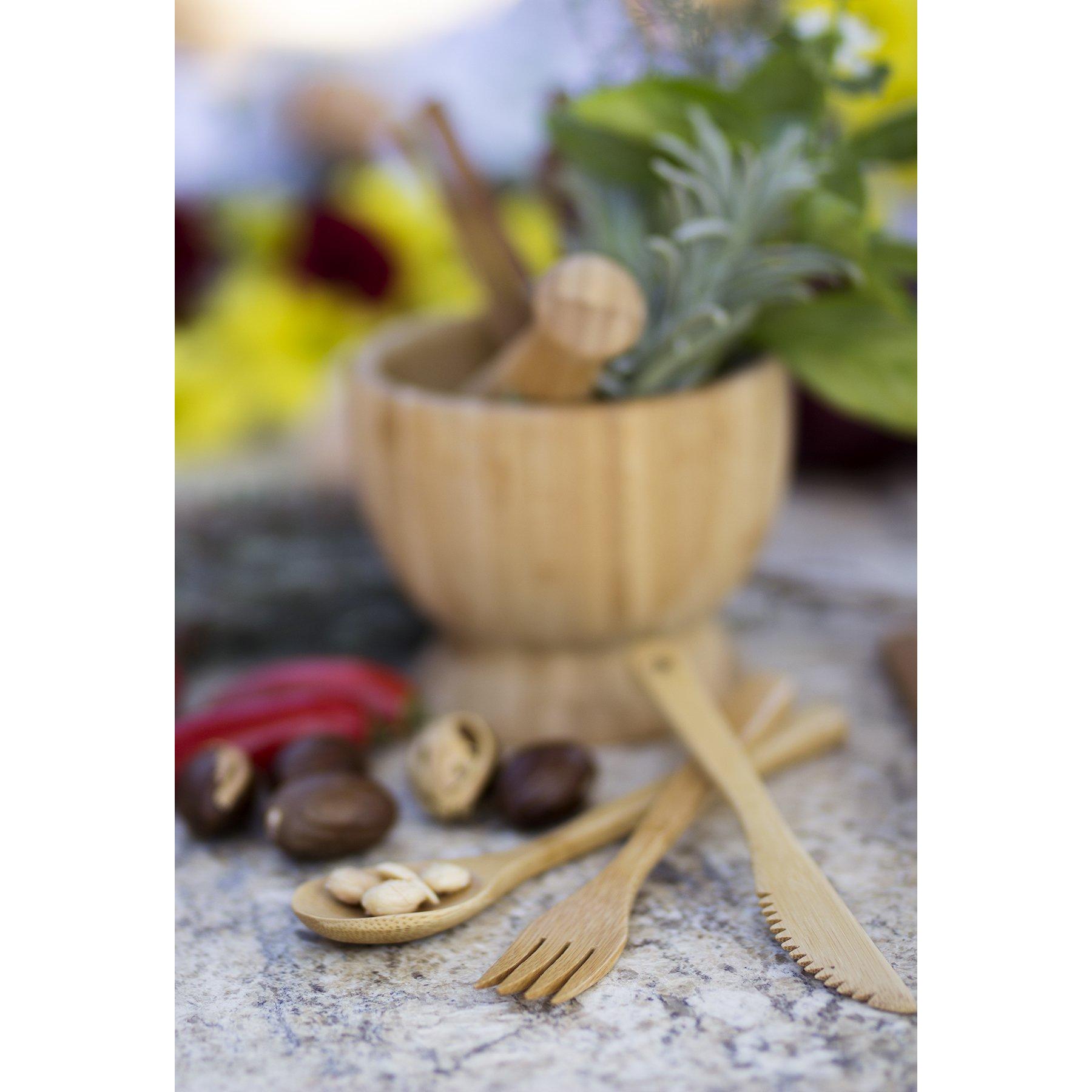 Reusable bamboo flatware set. In this set knife, spoon and fork are available. Our wide range utensils offer clever solutions for everyday culinary needs. Each Utensil size is 8″ long. Complies with Prop 65. 8″ L